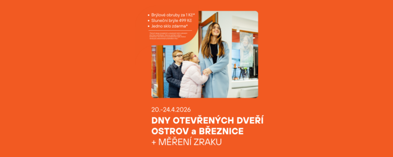 Využijte jedinečnou příležitost pořídit si nové brýle za výhodné ceny. Během dnů otevřených dveří pro vás máme připravenou speciální nabídku: obruby již od 1 Kč, sluneční brýle za 499 Kč, jedno sklo zdarma. Součástí akce je také měření zraku přímo na prodejně.